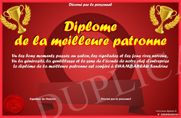 Envoyez par email votre Diplôme de la meilleure patronne personalisé