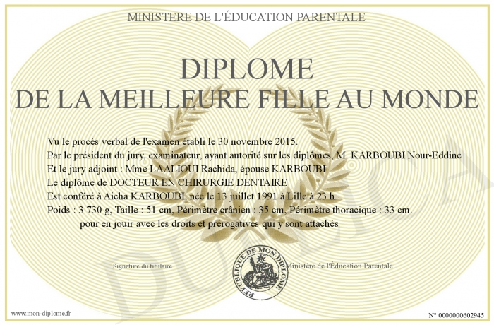 Envoyez par email votre Diplôme de la Meilleure Fille au Monde personalisé