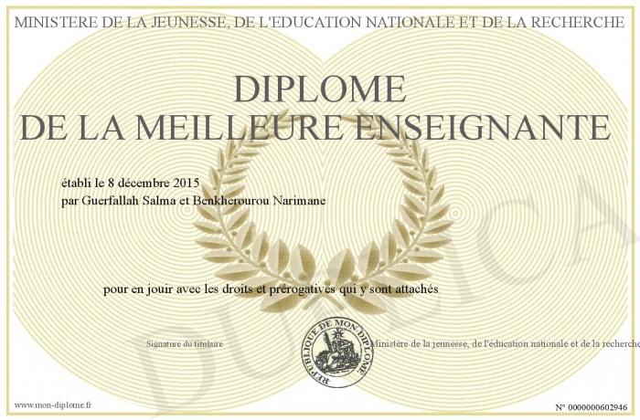Envoyez par email votre Diplôme de la meilleure enseignante personalisé