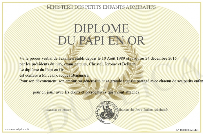 Envoyez par email votre Diplôme du Papi en Or personalisé