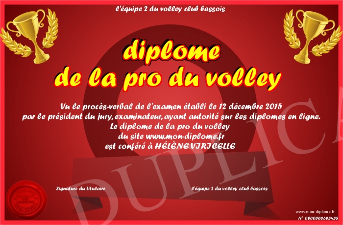 Envoyez par email votre diplôme de la pro du volley personalisé
