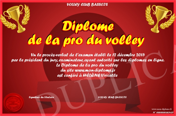 Envoyez par email votre Diplôme de la pro du volley personalisé