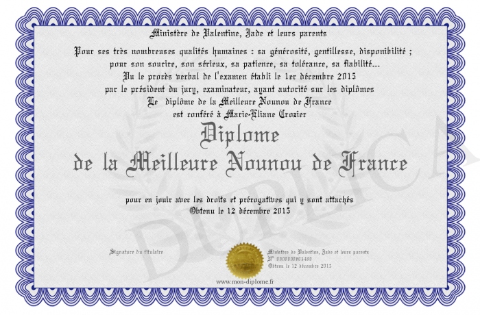 Envoyez par email votre Diplôme de la Meilleure Nounou de France personalisé