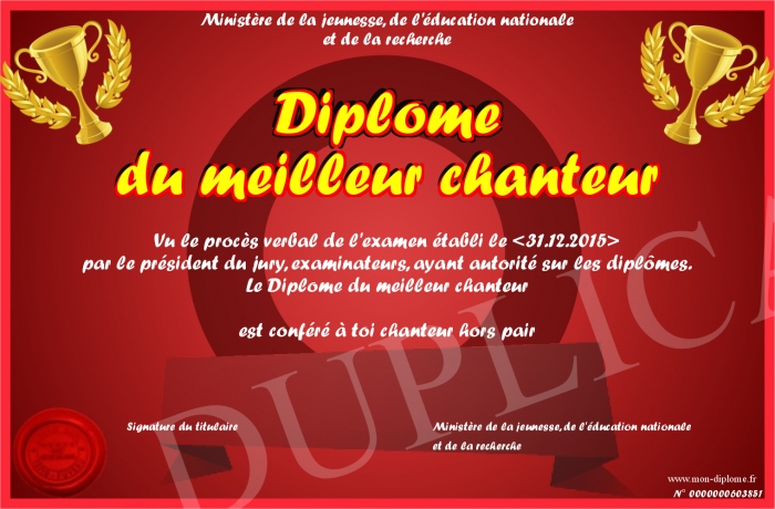 Envoyez par email votre Diplôme du meilleur chanteur personalisé