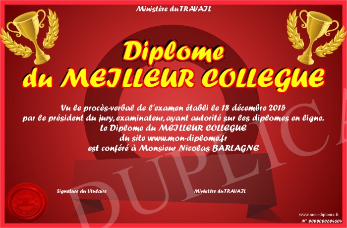 Envoyez par email votre Diplôme du MEILLEUR COLLEGUE personalisé