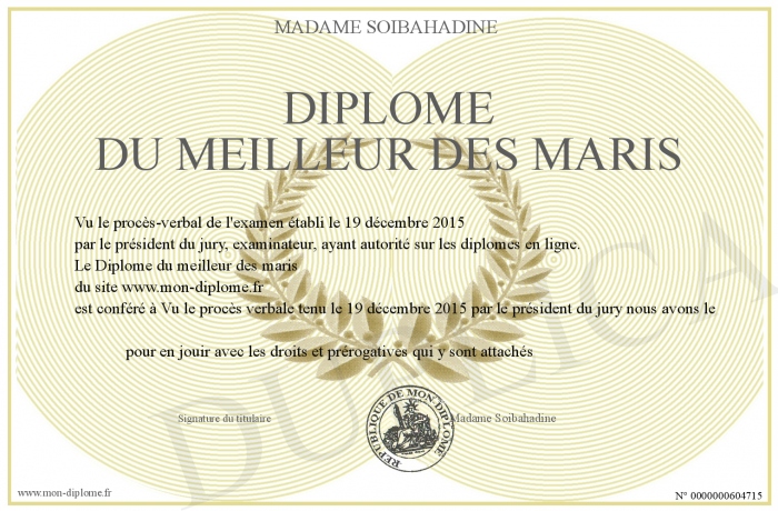Envoyez par email votre Diplôme du meilleur des maris personalisé