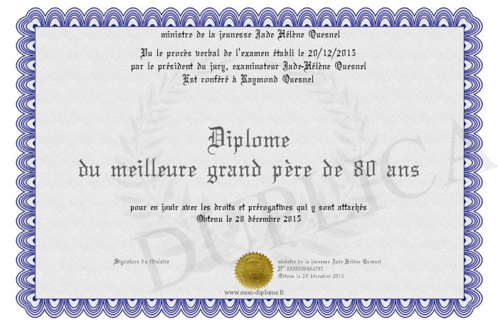 Envoyez par email votre Diplôme du meilleure grand père de 80 ans personalisé