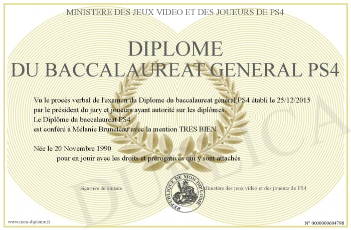 Envoyez par email votre Diplôme du baccalaureat général PS4 personalisé