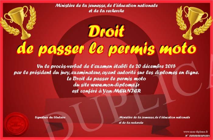 Envoyez par email votre Droit de passer le permis moto personalisé