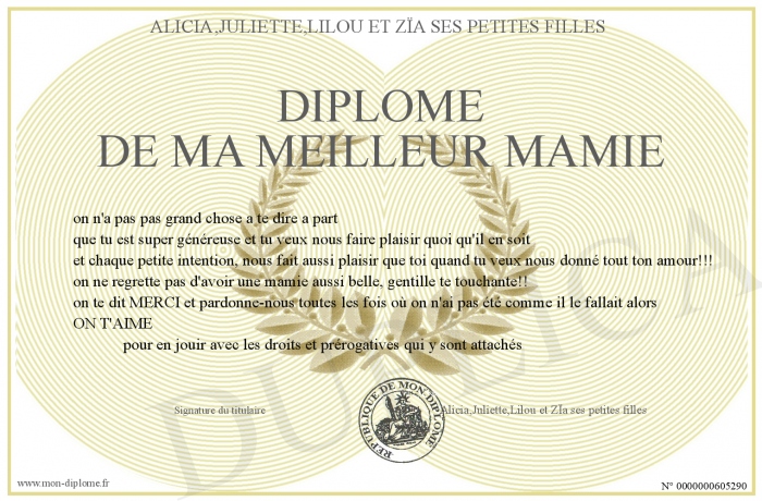 Envoyez par email votre Diplôme de ma meilleur mamie personalisé