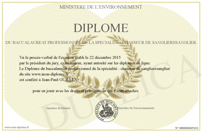 Envoyez par email votre Diplôme du baccalauréat professionnel de la spécialité : chasseur de sanglierssanglier personalisé