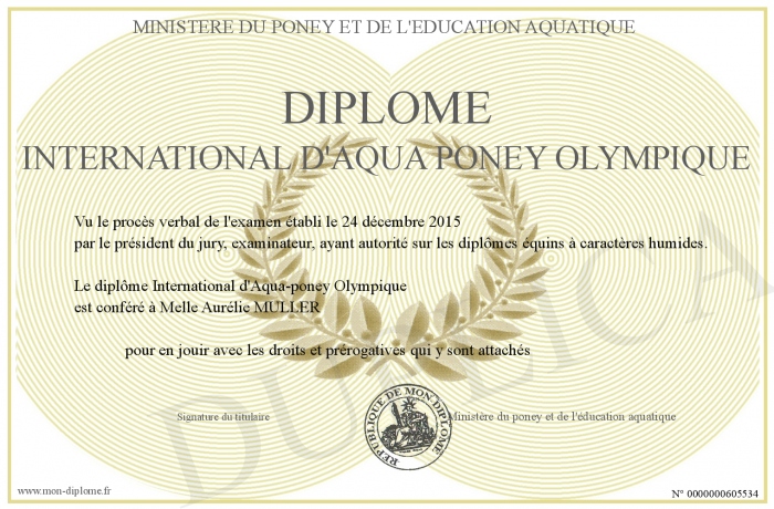 Envoyez par email votre Diplôme International d'Aqua Poney Olympique personalisé