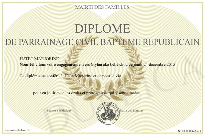 Envoyez par email votre Diplôme de parrainage civil Bapteme républicain personalisé
