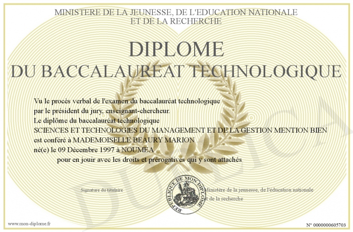 Envoyez par email votre Diplôme du baccalaureat technologique personalisé