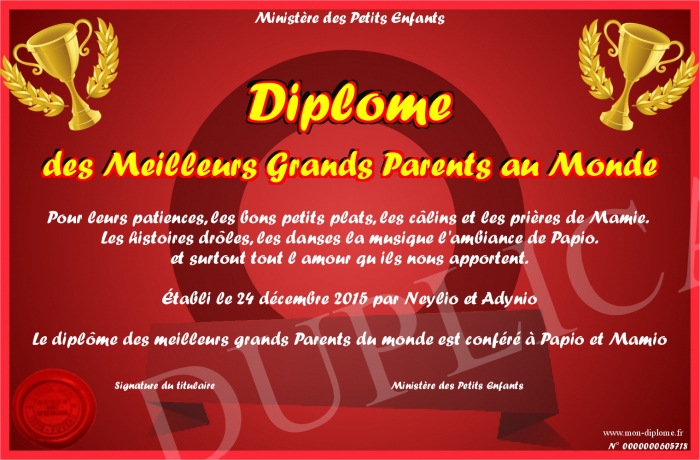 Envoyez par email votre Diplôme des Meilleurs Grands Parents au Monde personalisé