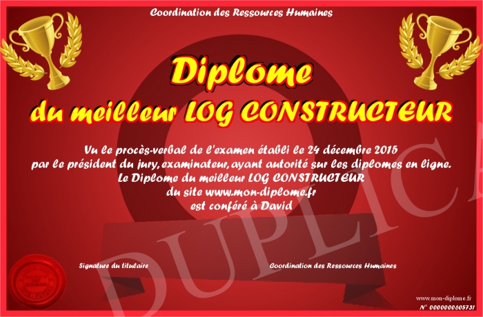 Envoyez par email votre Diplôme du meilleur LOG CONSTRUCTEUR personalisé