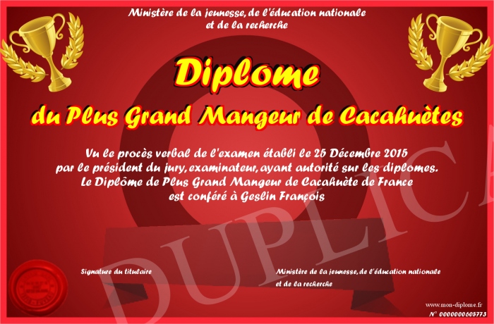 Envoyez par email votre Diplôme du Plus Grand Mangeur de Cacahuètes personalisé