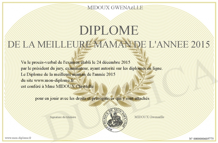 Envoyez par email votre Diplôme de la meilleure maman de l'année 2015 personalisé