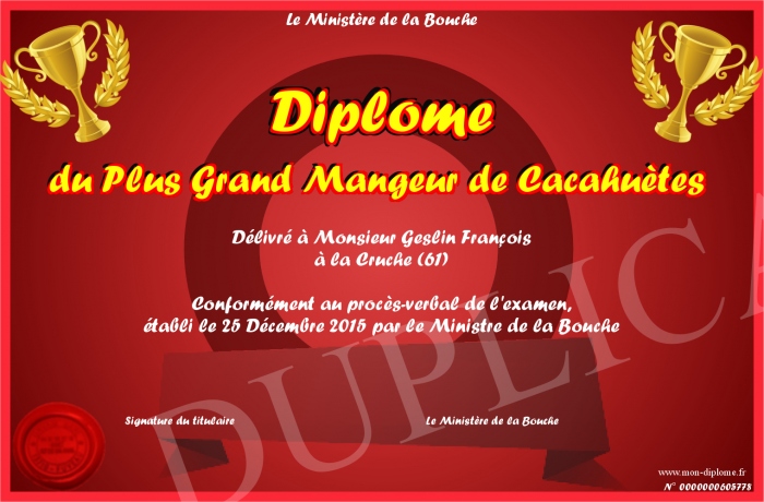 Envoyez par email votre Diplôme du Plus Grand Mangeur de Cacahuètes personalisé