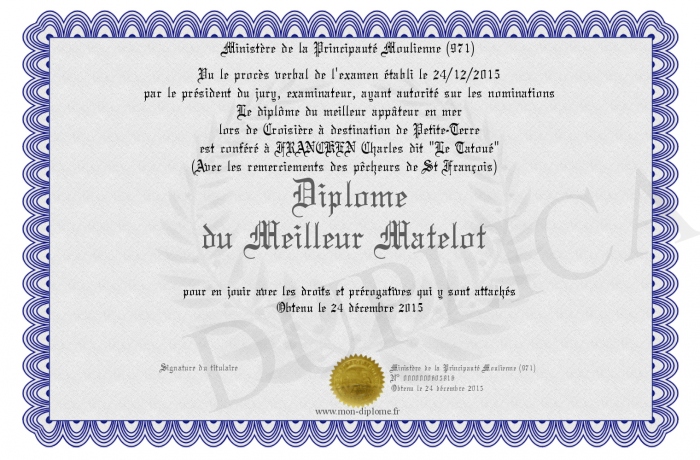 Envoyez par email votre Diplôme du Meilleur Matelot personalisé