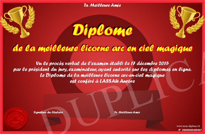 Envoyez par email votre Diplome de la meilleure licorne arc en ciel magique personalisé