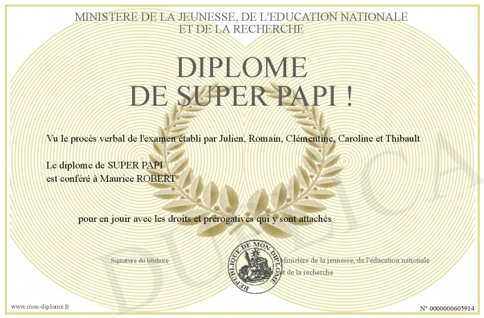 Envoyez par email votre Diplôme de SUPER PAPI ! personalisé