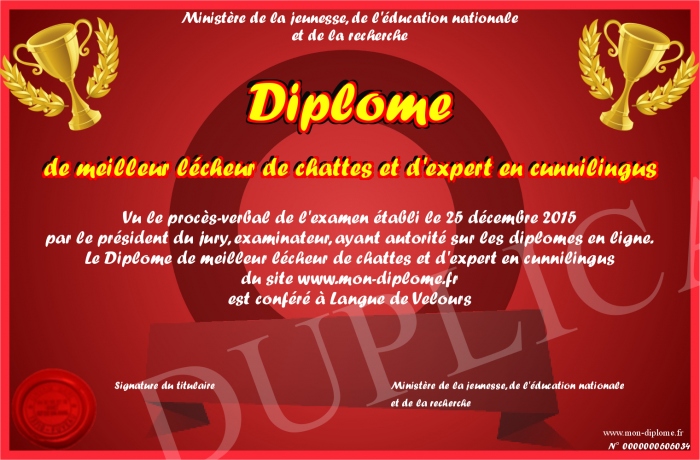 Envoyez par email votre Diplôme de meilleur lécheur de chattes et d'expert en cunnilingus personalisé