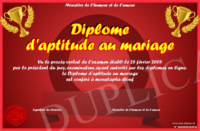 Envoyez par email votre Diplome d'aptitude au mariage personalisé
