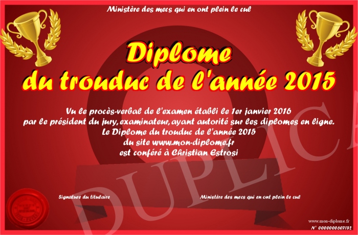 Envoyez par email votre Diplome du trouduc de l'année 2015 personalisé