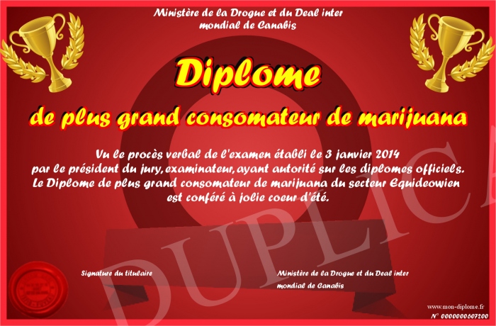 Envoyez par email votre Diplôme de plus grand consomateur de marijuana personalisé