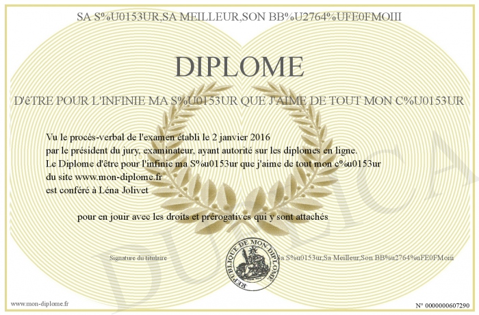 Envoyez par email votre Diplôme d'être pour l'infinie ma Soeur que j'aime de tout mon coeur personalisé
