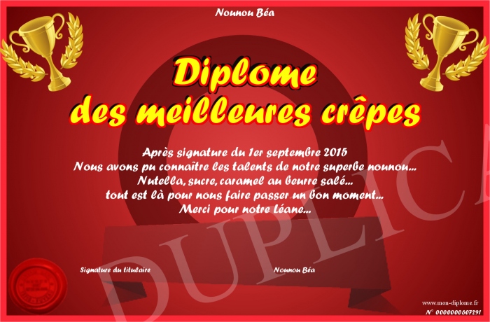 Envoyez par email votre Diplôme des meilleures crêpes personalisé