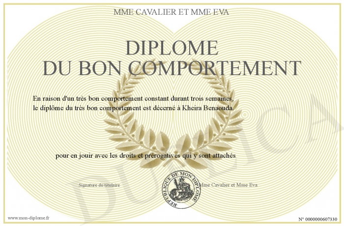 Envoyez par email votre Diplôme du bon comportement personalisé