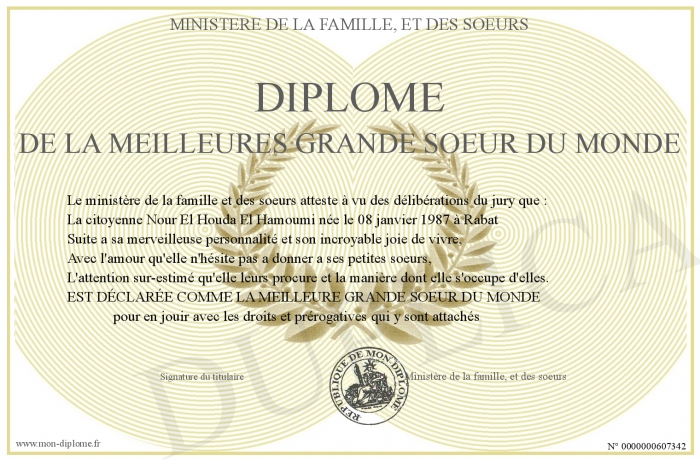 Envoyez par email votre Diplôme de la meilleures grande soeur du monde personalisé