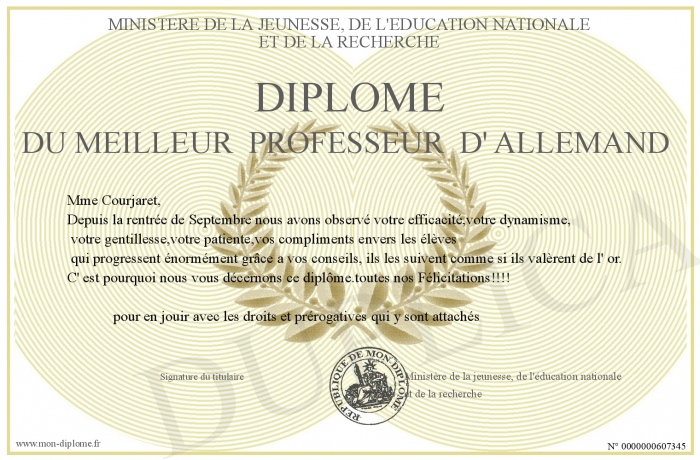 Envoyez par email votre Diplôme du meilleur professeur d' Allemand personalisé