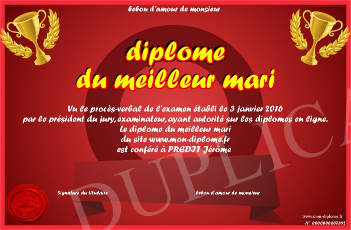 Envoyez par email votre diplôme du meilleur mari personalisé