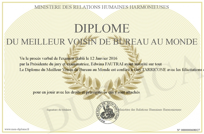Envoyez par email votre Diplôme du Meilleur Voisin de Bureau au Monde personalisé