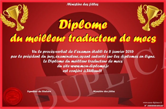 Envoyez par email votre Diplôme du meilleur traducteur de mecs personalisé