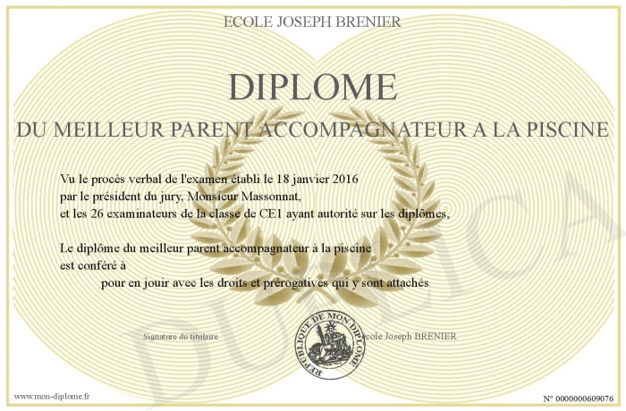 Envoyez par email votre Diplôme du meilleur parent accompagnateur a la piscine personalisé