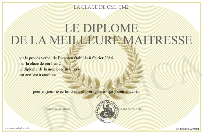 Envoyez par email votre le diplôme de la meilleure maitresse personalisé