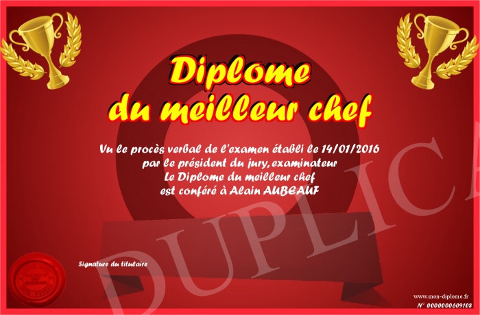 Envoyez par email votre Diplôme du meilleur chef personalisé