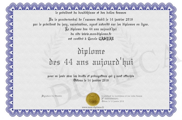 Envoyez par email votre diplôme des 44 ans aujourd'hui personalisé