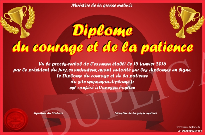 Envoyez par email votre Diplome du courage et de la patience personalisé