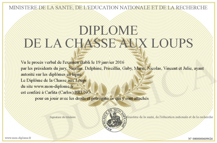 Envoyez par email votre Diplôme de la chasse aux loups personalisé