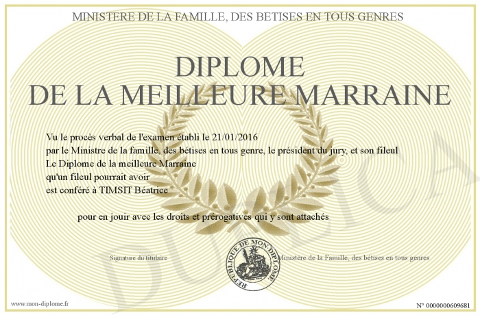 Envoyez par email votre Diplôme de la meilleure Marraine personalisé