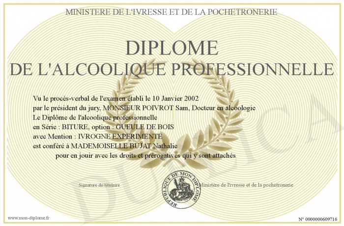 Envoyez par email votre Diplôme de l'alcoolique professionnelle personalisé
