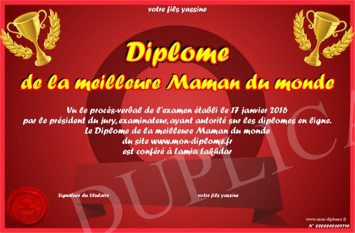 Envoyez par email votre Diplôme de la meilleure Maman du monde personalisé
