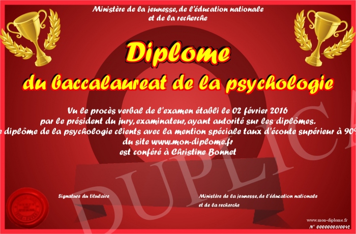 Envoyez par email votre Diplôme du baccalaureat de la psychologie personalisé