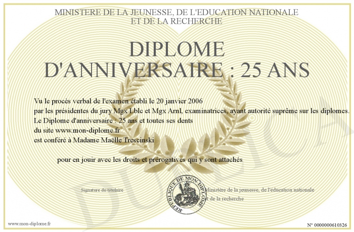 Envoyez par email votre Diplôme d'anniversaire : 25 ans personalisé