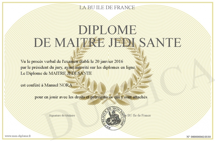 Envoyez par email votre Diplôme de MAITRE JEDI SANTE personalisé